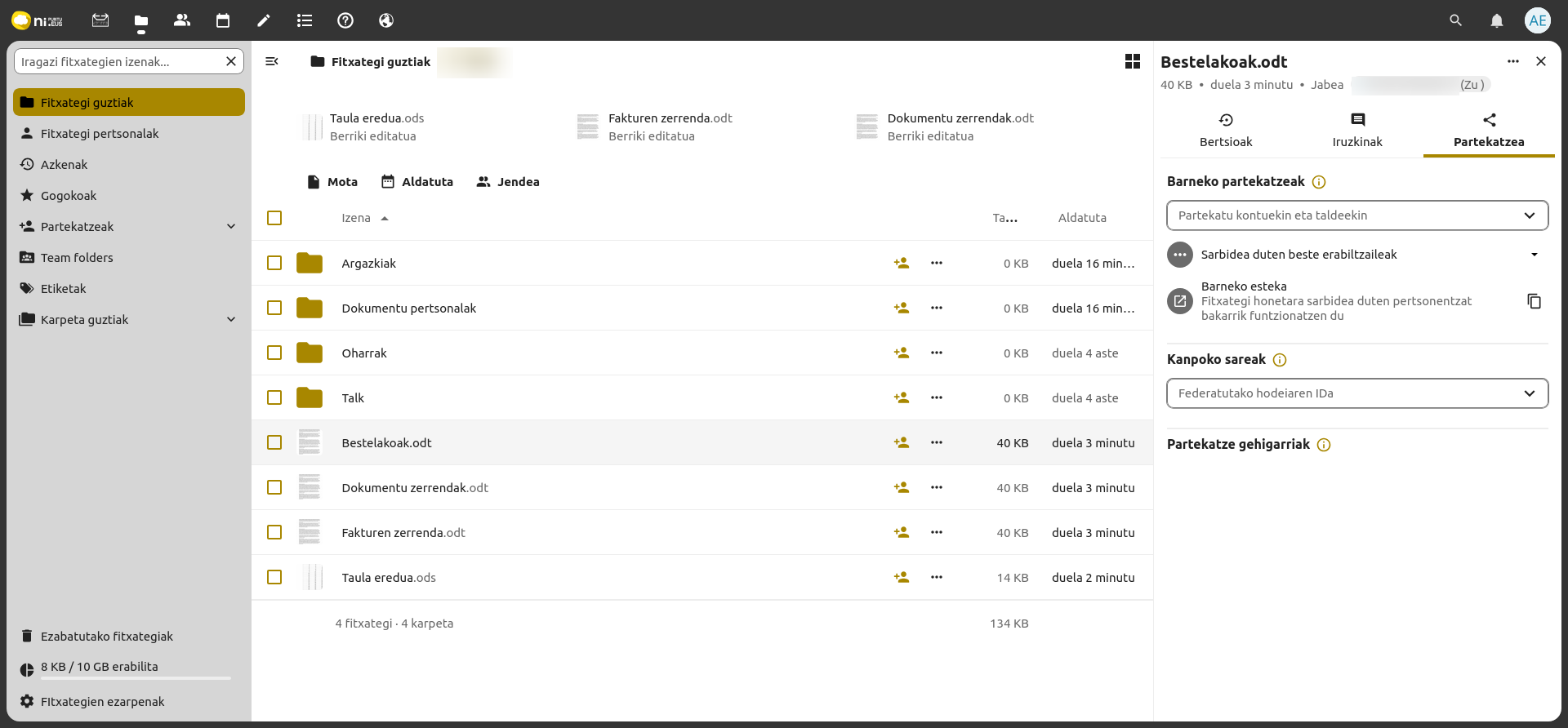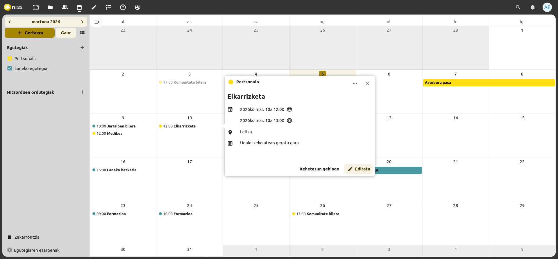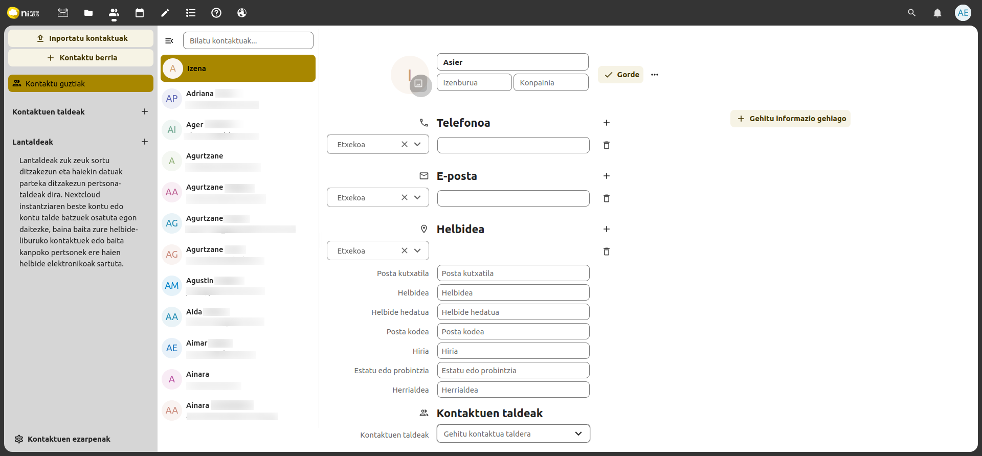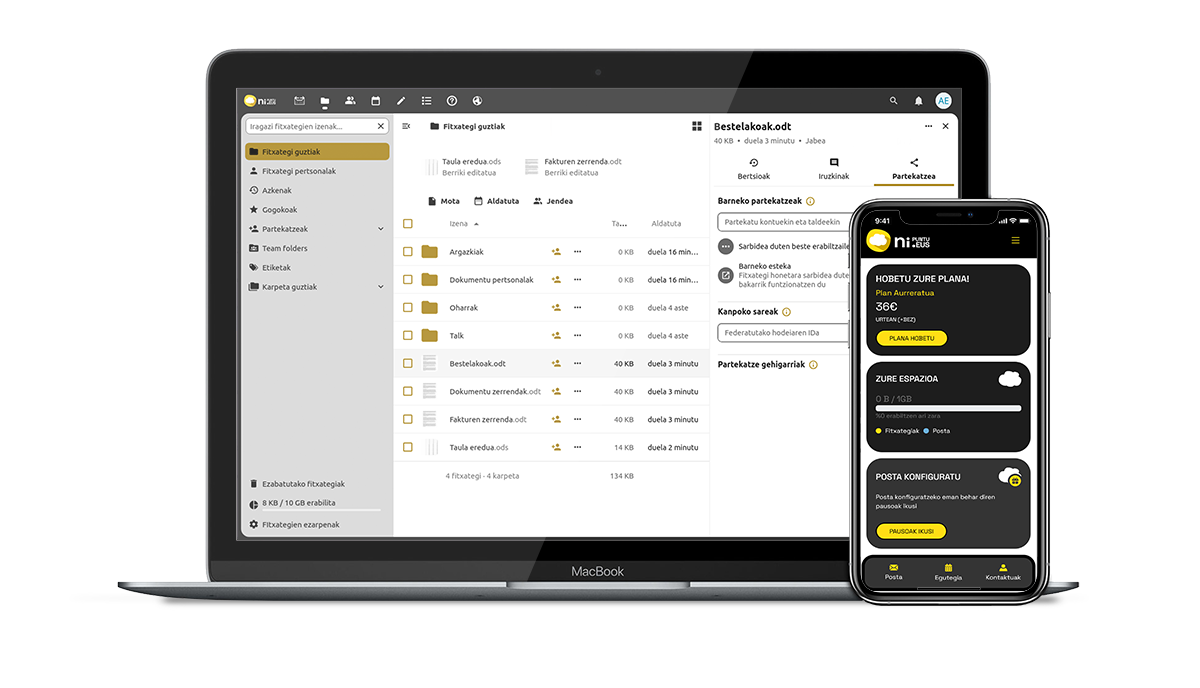 - Funtzionalitate berriak integratu ditugu, Nextcloud software librean oinarrituta, hodeiko plataforma seguru bat eskainiz; horri esker, posta elektronikoaz harago, lankidetza-tresna osoak eskaintzen dira leku berean, hala nola dokumentuen edizio kolaboratiboa, egutegiak, kontaktuak, txata edo bideo-deiak.